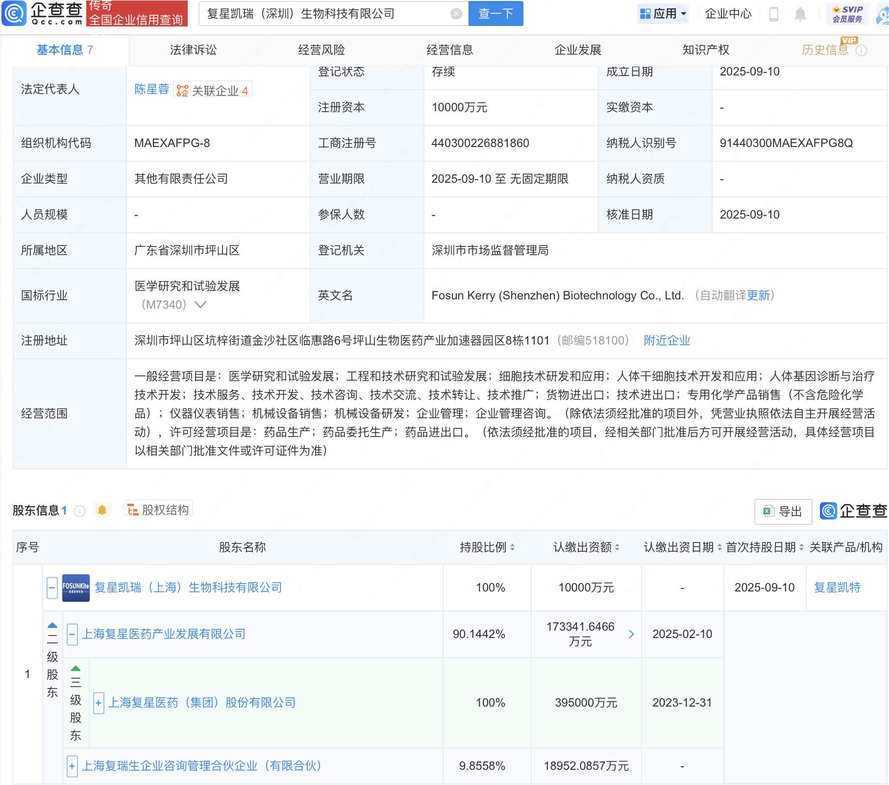 近日,复星凯瑞(深圳)生物科技有限公司成立,法定代表人为陈星蓉,注册资本1亿人民币,经营范围含医学研究和试验发展、细胞技术研发和应用、人体干细胞技术开发和应用、人体基因诊断与治疗技术开发等。企查查股权穿透显示,该公司由复星医药(600196)旗下复星凯瑞(上海)生物科技有限公司全资持股。